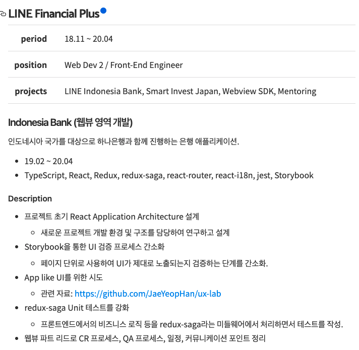 - 회사별로, 프로젝트 별로 나누어서 자신이 한 일을 설명