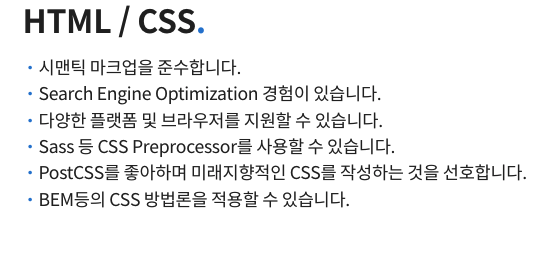 - 개인적으로 맘에 들었던 부분은 Skills 부분인데 굉장히 디테일하고 자세히 적어놓았다. HTML, CSS도 딸랑 적어놓는 경우가 많은데 아래 처럼 디테일하게 적어놓았다.